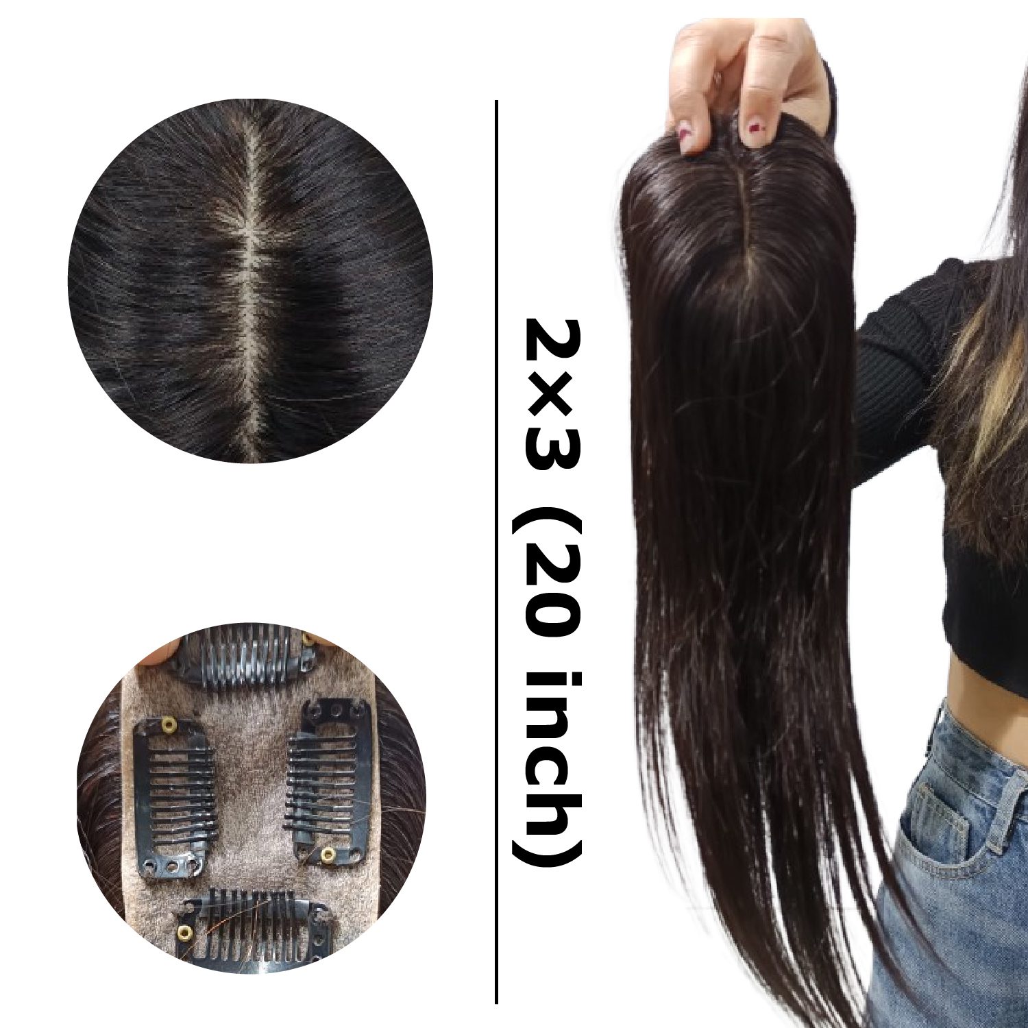 Silk Hair topper 2×3 16″ Natural Black – Silk base, clip-in topper with 16″ straight hair; great for natural coverage and added volume.
