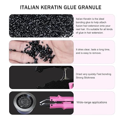 Description: These Premium Italian Black Keratin Grain Glue Beads are specially formulated for hair extensions, offering superior bonding capabilities. Each pack contains 25 grams of high-quality keratin beads, making them ideal for various hair extension techniques.