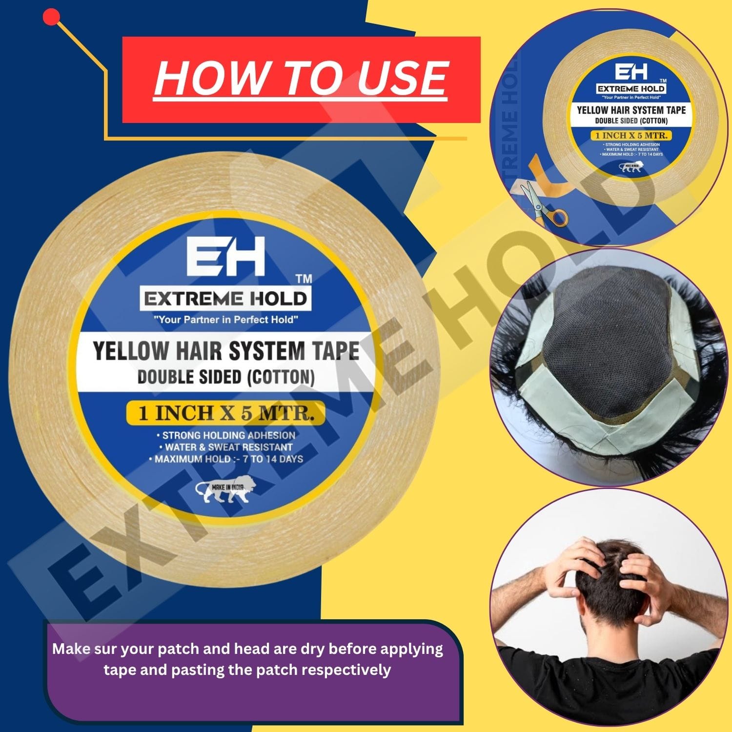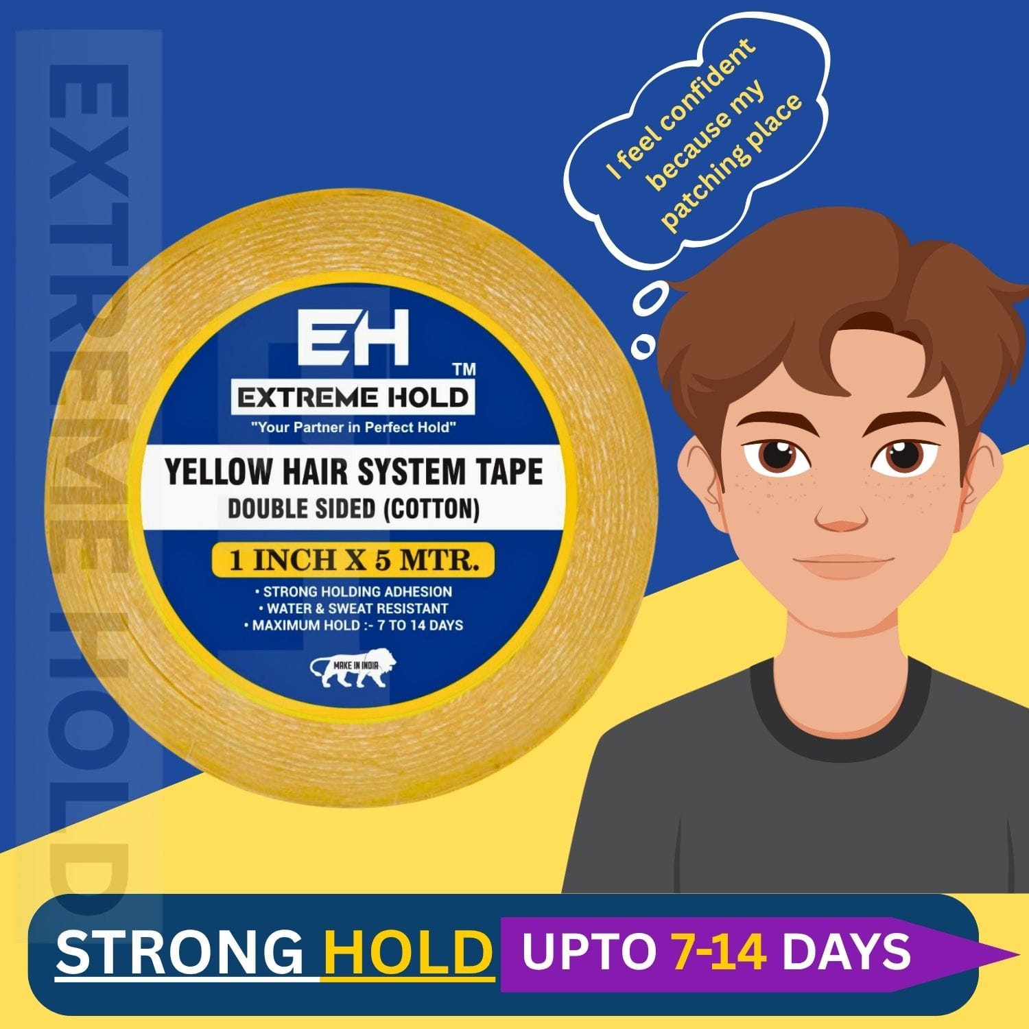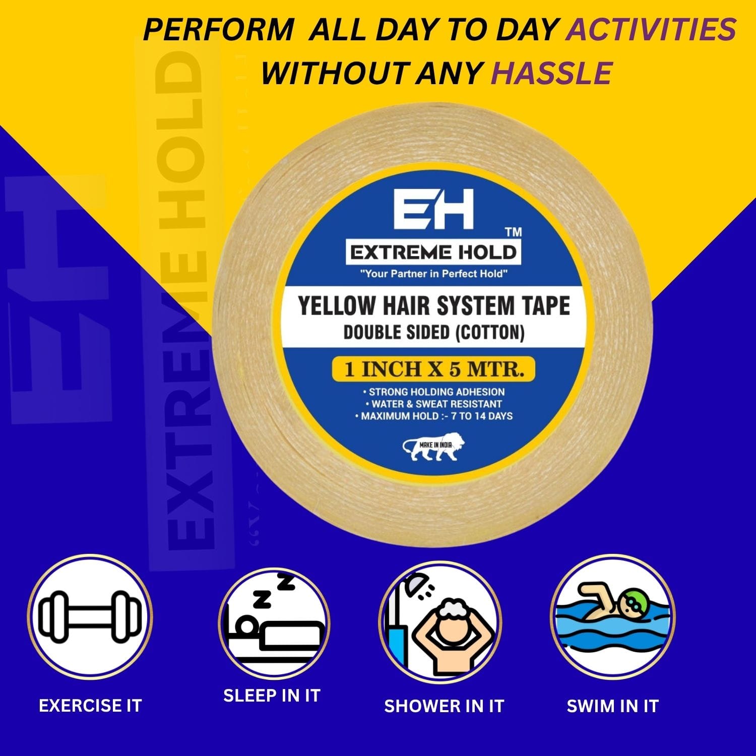 Upgrade your hair system with Growth Yellow wig Tape, the ultimate solution for a secure and long-lasting hold. Crafted from 1-inch cotton material, this 5-meter double-sided tape ensures your hair patch stays in place no matter the conditions.