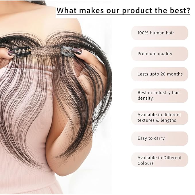 Clip in Bangs Trendy Way To Freshen Up Your Casual Hairstyle, No Cutting, No Commitment, No Damage! Clip in Bangs Hair Features – Remy Human Hair: Natural, soft, and long lasting – 1 Pressure-Sensitive clips in design, make the bangs stay in place for all day use – More natural and perfect blending – Can be trimmed, heated, dyed base on your own needs – Just clip and go, transform your look instantly – Change your look without going to a salon or committing to a totally new haircut How to Wear? 1.Part your hair down the center. Use a comb to part your hair down the center 2. Place the bangs near the crown of your head 3. Secure the clip 4. Cover the clips and the edge of bangs with your hair 5. A beautiful bang has been finished TIPS We all items are for real shooting. For technology, display, light, environmental reasons, there may be a slight color difference. Please feel free to contact us for refund or replacement