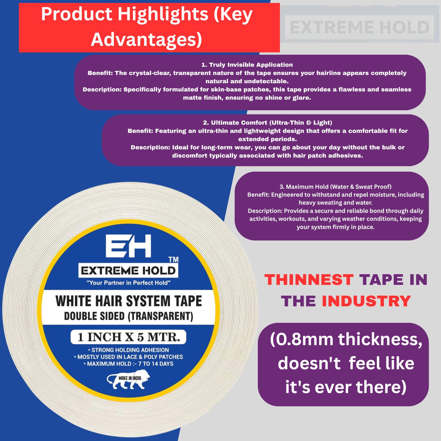 • The tape is clear and thin, making it virtually invisible once applied to the scalp. This allows for a seamless, natural look, ensuring the hair system remains undetectable.