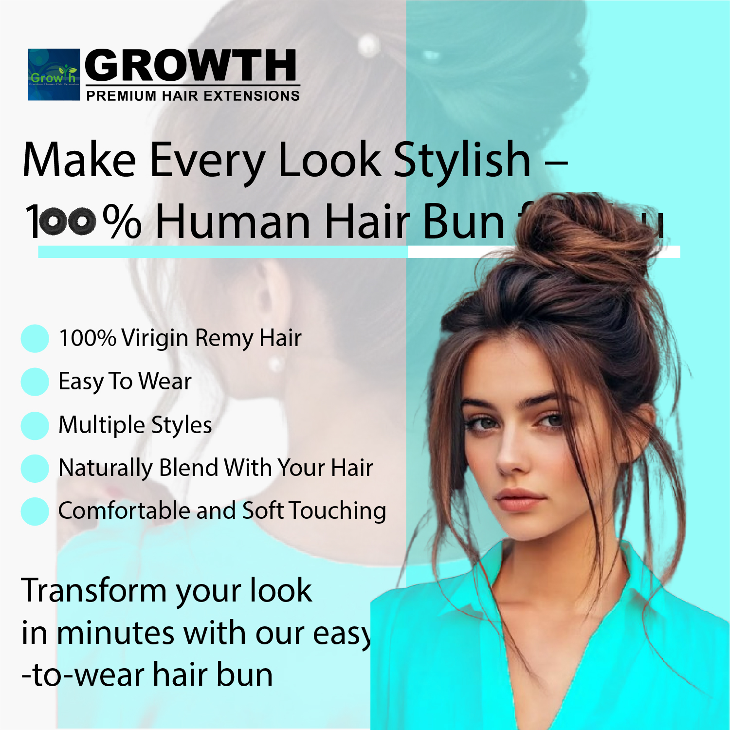 GROWTH Life is too short to have a bad hair day and we make sure you have #GoodHairDayEveryday. – Made for 100% human hair – Ethically sourced – Made for Everyday Use – Premium quality – Made by women, Made for everyone – Featured and funded on Shark Tank India Say bye to unmanageable hair and say Hello to Chic Messy Hair with 100% human hair messy bun scrunchie. -Voluminous hair bun – A quick fix for messy open hair – Turn an untidy flat bun into a gorgeous updo.